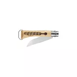 Praktyczny nóż na pikniki i inne wypady za miasto. Połączenie klasycznego noża Opinel 10 z wytrzymałym korkociągiem. Zarówno ostrze jak i sam corkscrew jest składany i mieści się w rękojeści. Klasyczny składany nóż Opinel 10 z rękojeścią z lakierowanego drewna bukowego. Ostrze (typu Yatagan) podobnie jak w innych modelach wykonane zostało ze stali nierdzewnej Sandvik 12C27. Dzięki ok. 0,40% ilości węgla w składzie nóż ma odpowiednią ostrość. Dodatek chromu gwarantuje skuteczną protekcję przed rdzą.